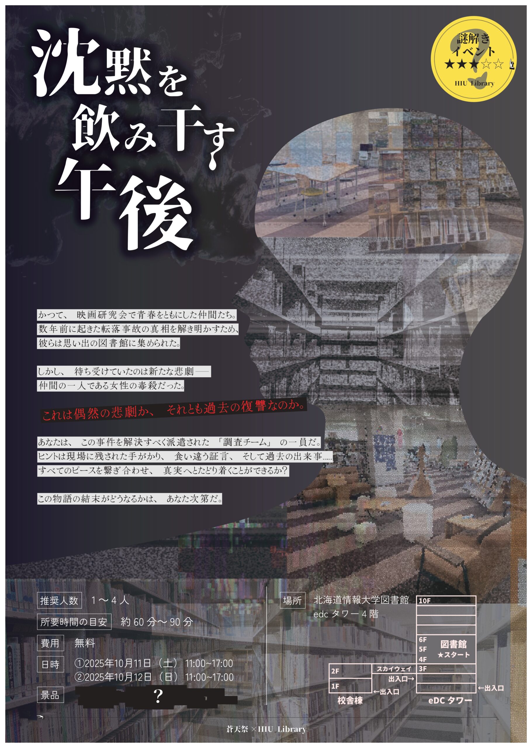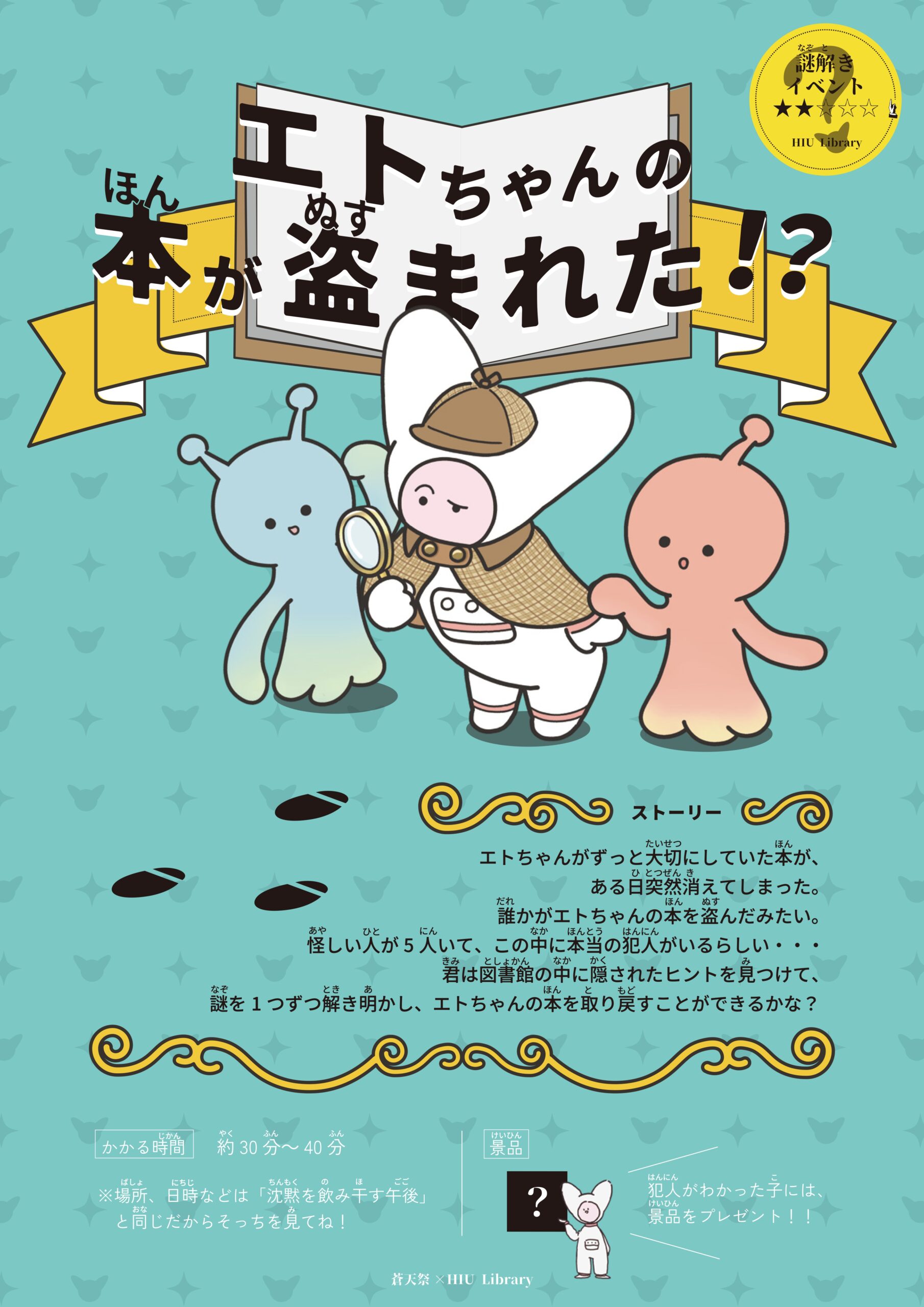 【蒼天祭】謎解きイベント開催! 2025年10月10日 すべて 今年の蒼天祭も、図書館を舞台に謎解きイベントを開催します🔍 なんと今回は、難易度・ストーリーの異なるタイトル2本立て! それぞれのストーリーは独立しているので、単体でもお楽しみいただけます。 『エトちゃんの本が盗まれた!?』 謎解きを気軽に楽しみたい方、お子様におすすめの難易度です。 『沈黙を飲み干す午後』 歯ごたえのある謎解きにチャレンジしたい方におすすめ! すべて一覧へ戻る